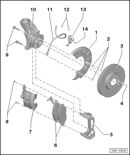 • Before removing a brake caliper or disconnecting a brake hose, the brake pedal actuator (V.A.G 1869/2) should be installed (relieve pressure).