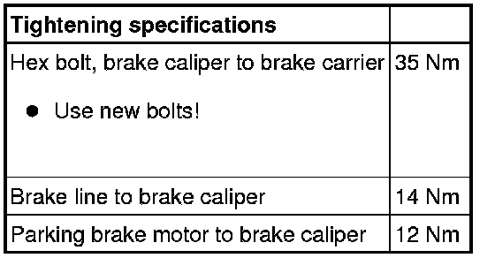 Work procedure applies only for replacing or when performing subsequent service work on brake caliper.