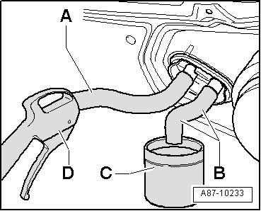 - Hold a container - C - under the hose of lower connection - B -.