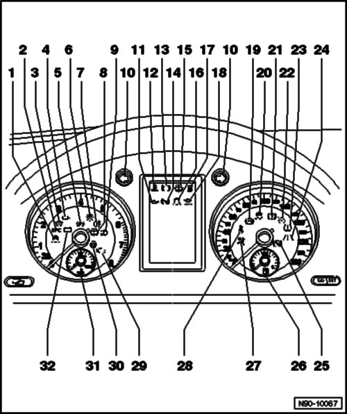 Assignment of warning lamps in instrument cluster is dependent on equipment, country-and engine versions of vehicle.