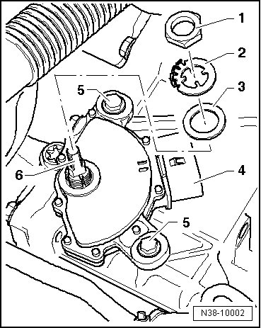 - Install the lock washer - 2 - with the long narrow guide into the long narrow depression in the selector shaft - 6 -.