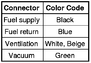 The connectors for the fuel, vacuum and ventilation lines are color coded. There is either a colored dot on the connector or the release button is the corresponding color.