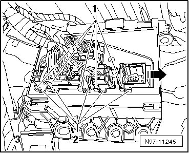 - Release the retaining tab - 3 - and slide the comfort system central control module in the bracket in the - direction of the arrow - until the openings on the connector - 1 - align with the openings - 2 - in the bracket.
