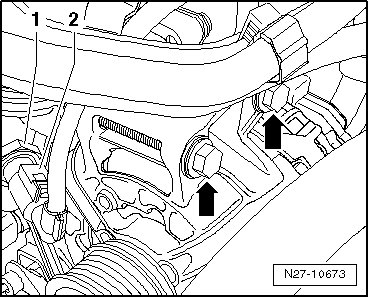- Remove both bolts - arrows - and move the coolant pipes and the hose - 1 - upward so that there is enough space to remove the generator.
