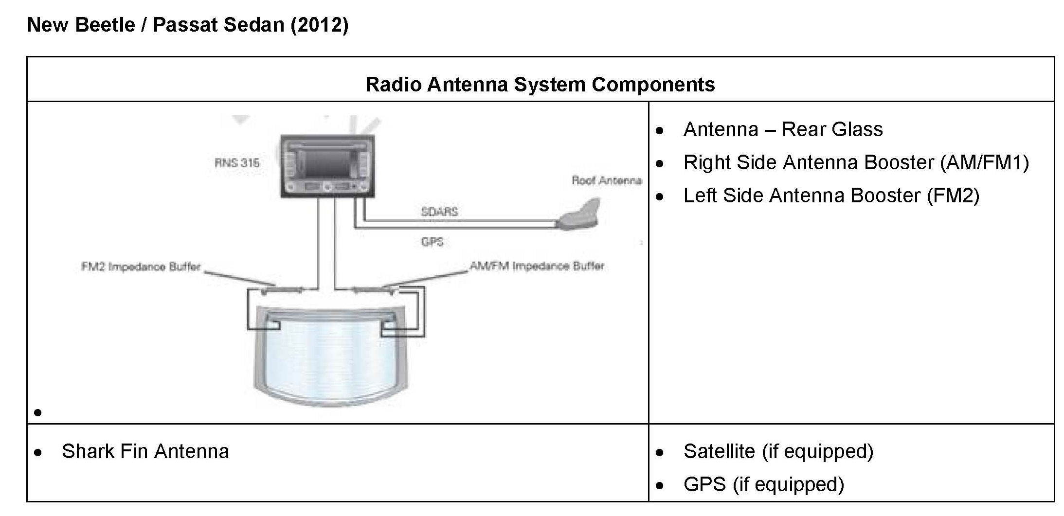 ^ Radios with internal satellite receiver: Is a message displayed on screen stating Satellite radio not available"? This indicates a radio concern. Swapping a known good similar radio is an easy check to confirm the radio is the problem. Applies to RNS-510, RNS-315, RCD-510, RCD-310 (with sat).