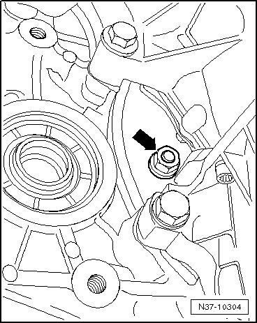- Press the brake pedal and remove the left drive axle bolt - arrow -. A second technician will be needed.