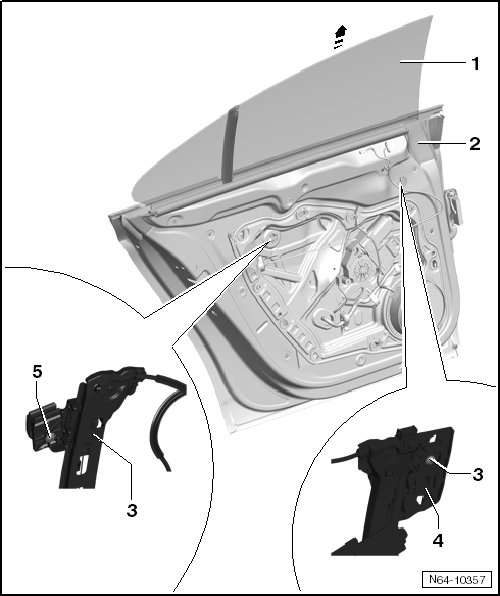 - Remove the door window - 1 - upward - arrow - out of the window shaft.