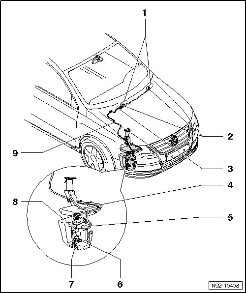 • One-part windshield washer system tank, removing and installing, refer to => [ One-Piece Washer Fluid Reservoir ] One-Piece Washer Fluid Reservoir.