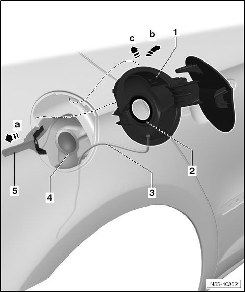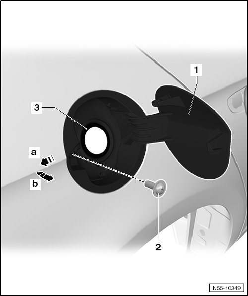 - Insert the fuel filler door unit - 1 - first with the hinge side into the side panel - arrow b -.