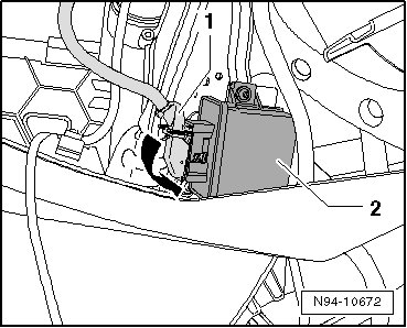- Disengage harness connector in - direction of arrow - and disconnect connector - 1 - from headlamp range/cornering lamp control module - 2 -.