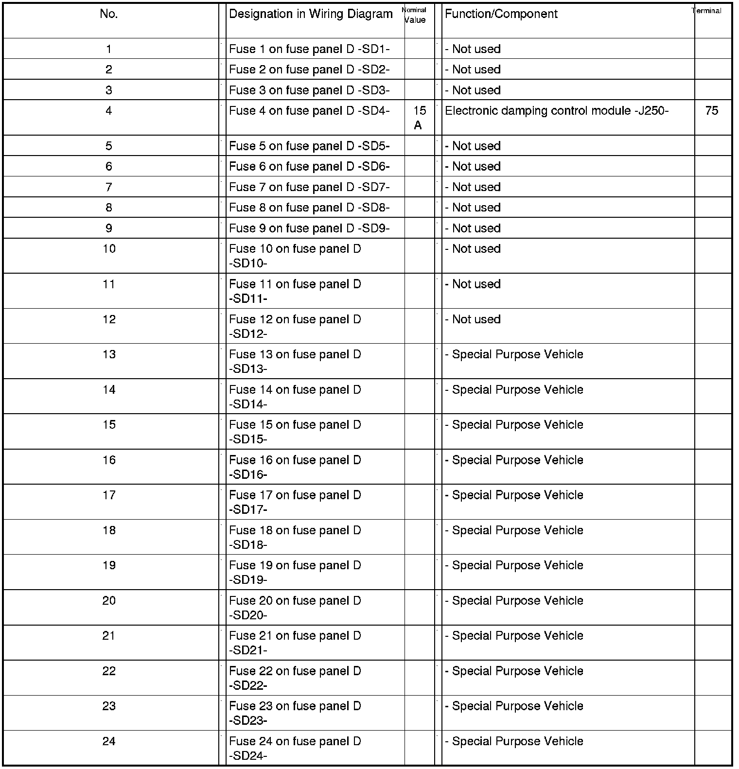 Fuse assignment on fuse panel D -SD- , instrument panel on the front passenger side
