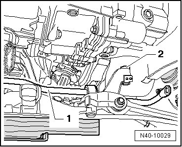 - Place a block of wood - 1 - between the engine-/gearbox jack (V.A.G 1383 A) and the subframe.