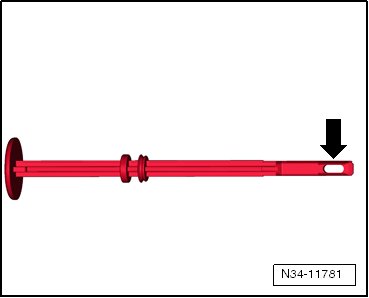 - Press the button and push the assembly aid (with the eye) - arrow - all the way in until it latches into place. Then release the button. The button locks in the installed position when the assembly aid is pulled out.