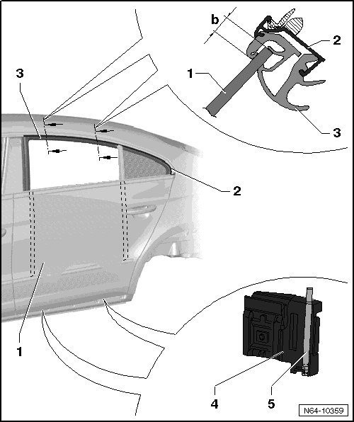 - Install the adjusting screws - 5 - on the window regulator - 4 - using the socket wrench (T10058) , until the measures are reached.