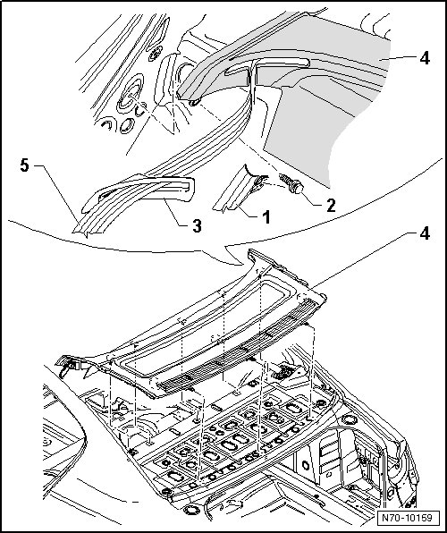 - Remove seat belt trim - 3 - on both sides from rear shelf - 4 -.