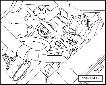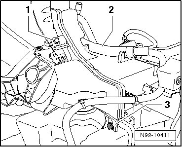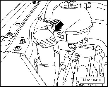 - Remove the bolt - 1 - and unclip the line - arrow - from the upper section of the reservoir.