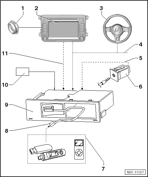 The audio signal of the unit connected to the AUX IN socket runs from the multimedia interface into the AUX input of the radio or radio/navigation system.