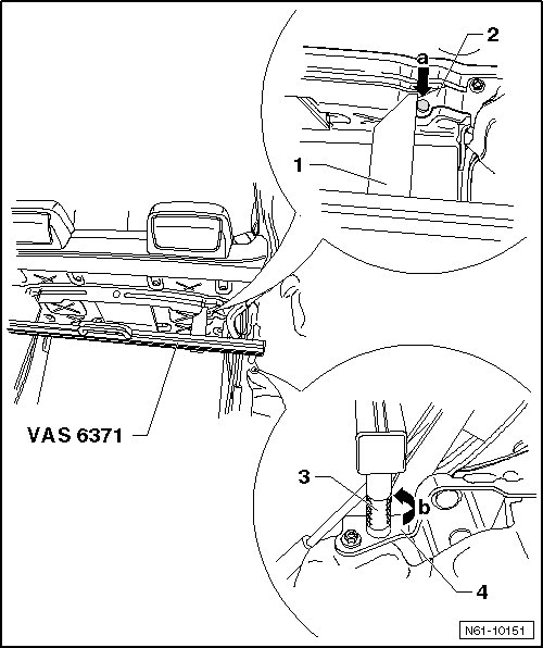 - Lower the main bearing gauge (VAS 6371) on the main hinge - 4 - and rotate the gauge pins - 3 - until they slide into mounting holes - arrow b -.