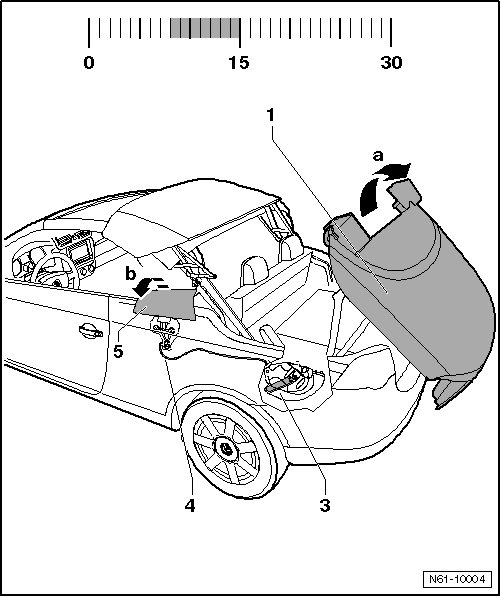 Hydraulic cylinder - 3 - moves main hinge - 2 - with entire roof for storage in luggage compartment - arrow a -.