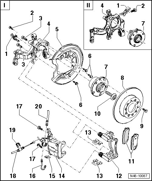 • Before removing brake caliper or disconnecting brake hose, brake pedal actuator (V.A.G 1869/2) must be inserted (this dissipates pressure).