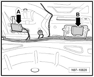 Behind the right luggage compartment side trim -Arrow B-