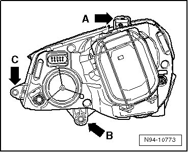 If the upper headlamp mounting tab - A -, the outer headlamp mounting tab - C - or the lower headlamp mounting tab - B - should be damaged or broken off, they can be replaced by installing the repair set. It is not necessary to replace the entire headlamp.