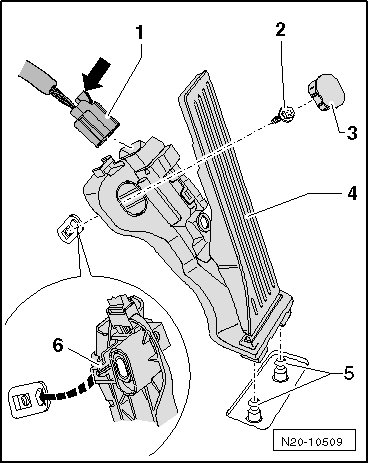 - Disconnect the connector - 1 - - arrow - from the accelerator pedal module.