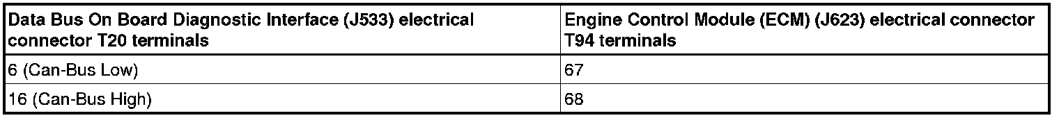 - Using a multimeter, check the Data Bus On Board Diagnostic Interface (J533) electrical harness connector to the Engine Control Module (ECM) (J623) electrical harness connector T94 for resistance.