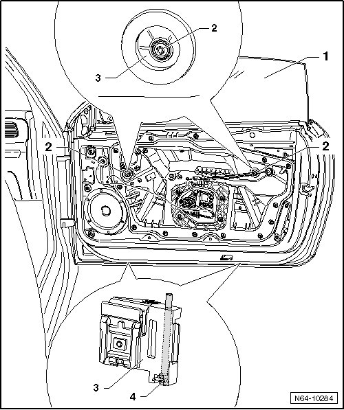 - Lower the door window until clamping screws - 2 - of door window - 1 - are accessible.