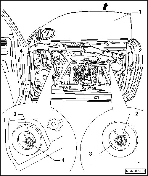 - Lower the door window until clamping screws - 2 - of door window - 1 - are accessible.