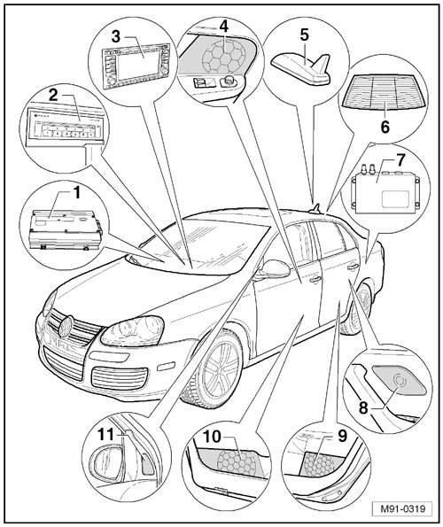 • Overview of electrical connections, => [ Radio Navigation System Multi-Pin Connector Assignments ] Connector Views