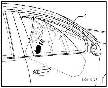 - Raise rear door window - 1 - and swivel out of door toward front in - direction of arrow -.