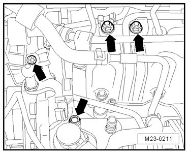 - Loosen the high pressure line or fuel line bolts - arrows - on the intake manifold.