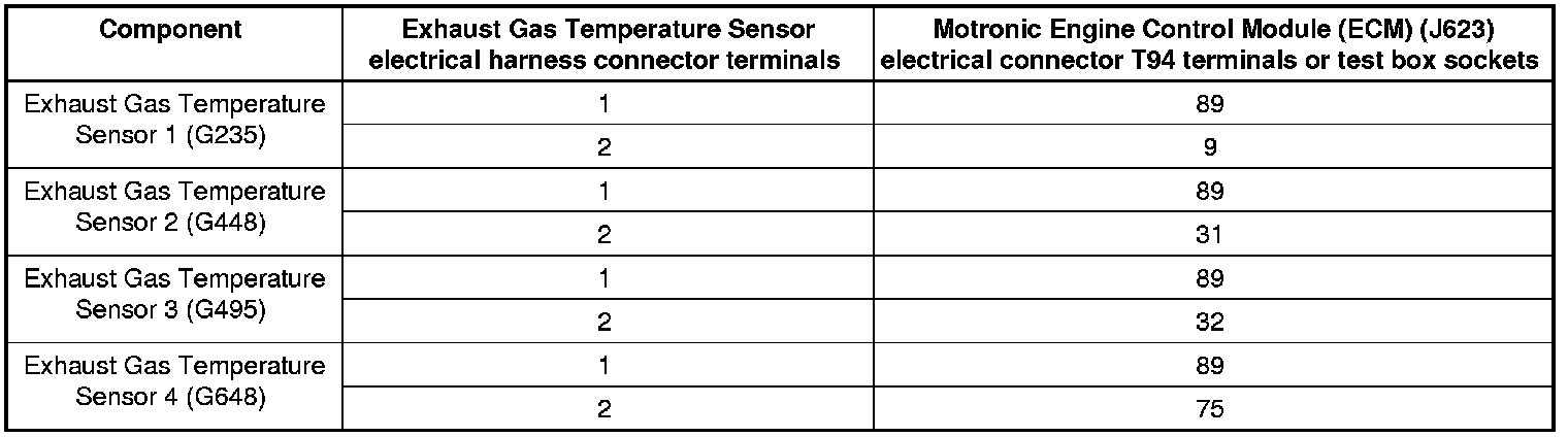 - Using a multimeter, check the Exhaust Gas Temperature Sensor electrical harness connector terminals to the Motronic Engine Control Module (ECM) (J623) electrical harness connector T94 connector for resistance.
