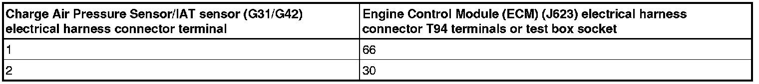 - Using a multimeter, check the Charge Air Pressure Sensor/IAT sensor (G31/G42) electrical harness connector to the Engine Control Module (ECM) (J623) electrical harness T94 connector for resistance.