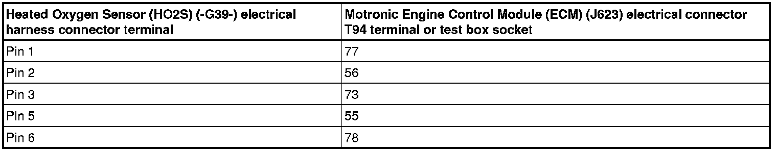 - Using a multimeter, check the Heated Oxygen Sensor (HO2S) (-G39-) electrical harness connector terminals to the Motronic Engine Control Module (ECM) (J623) electrical connector T94 for an open circuit.