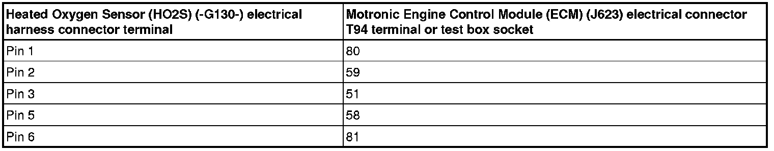 - Using a multimeter, check the Heated Oxygen Sensor (HO2S) (-G130-) electrical harness connector terminals to the Motronic Engine Control Module (ECM) (J623) electrical connector T94 for an open circuit.