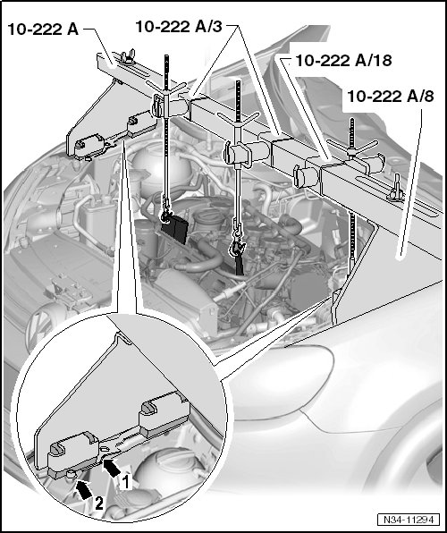 - Align the engine/transmission in its installed position. Lift it until the transmission mount bracket - 1 - is in complete contact with the transmission mount - 2 -.