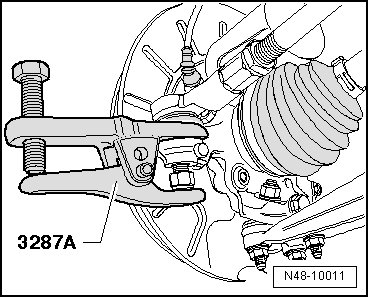- Press off tie rod end from wheel bearing housing with (3287 A) and then remove nut.