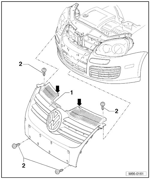 - Tip radiator grille - 1 - toward lock carrier and engage clips - arrows - in lock carrier.