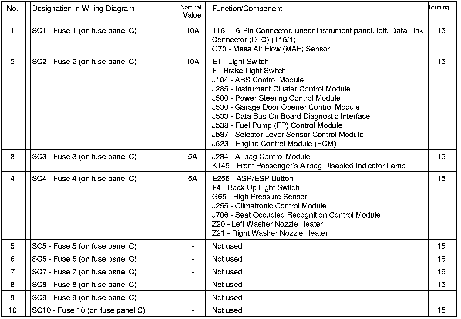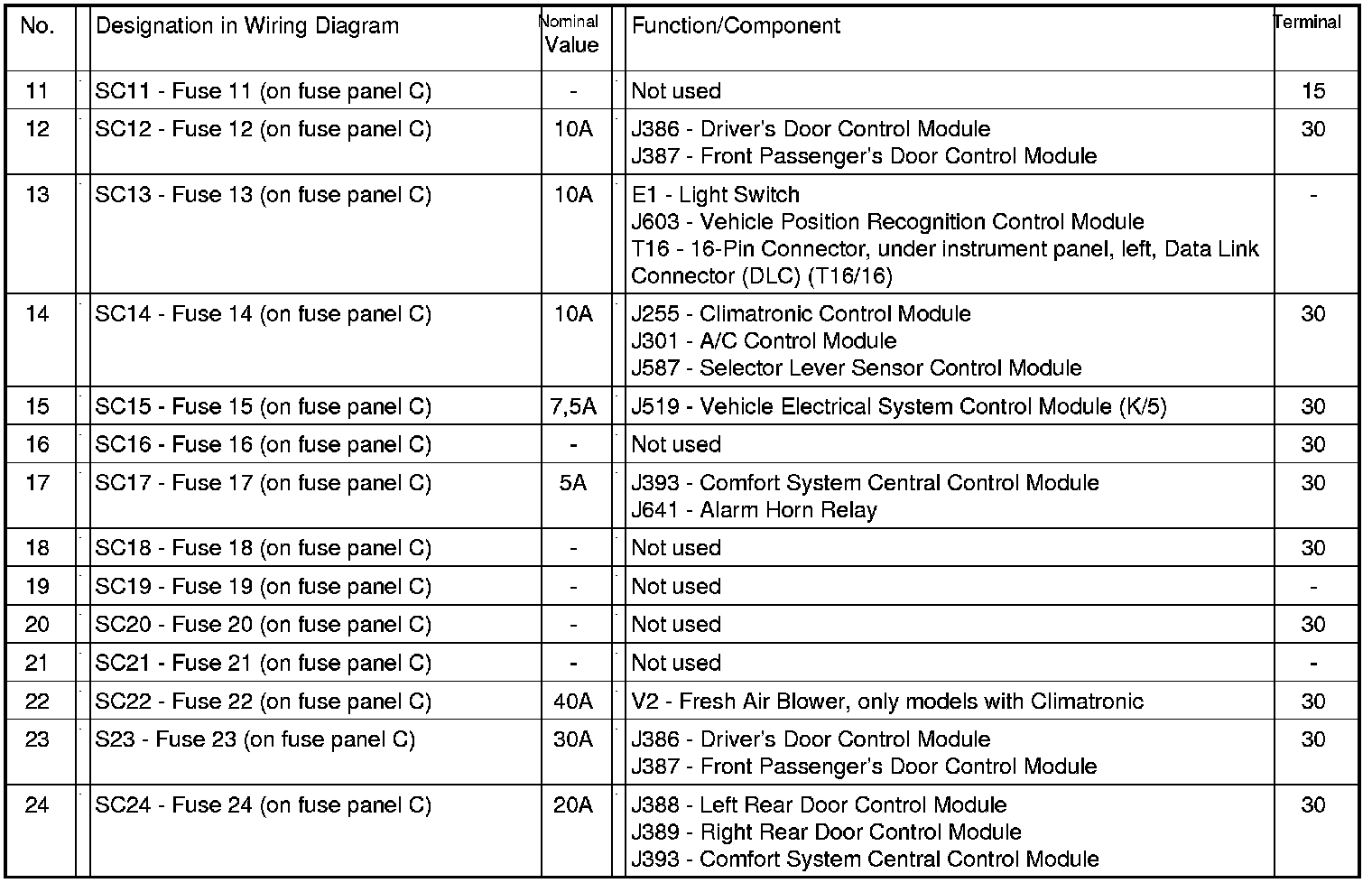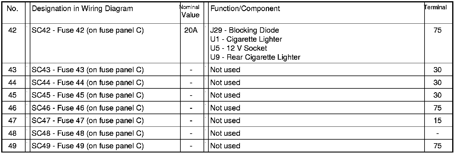 Fuses (SC) on fuse panel C (electronics box High), from July 2007