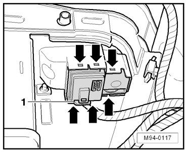 - Disengage the retaining tabs - arrows - and remove the fuel filler/rear lid remote unlocking button from the door trim.
