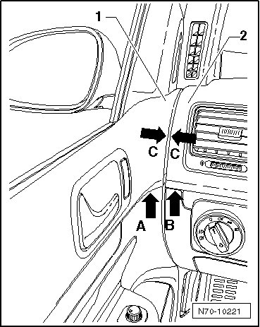 Instrument panel height is adjusted correctly when there is no offset between door trim seam - arrow A - and instrument panel seam - arrow B -.