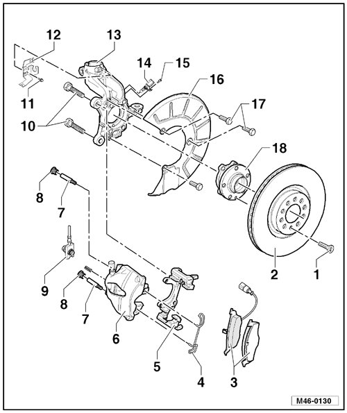 Before removing brake caliper or disconnecting brake hose, Brake Pedal Depressor (V.A.G 1869/2) must be inserted (this dissipates pressure).