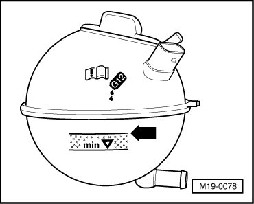 • With the engine at operating temperature, the coolant level must be at the top mark - arrow - of the hatched area.