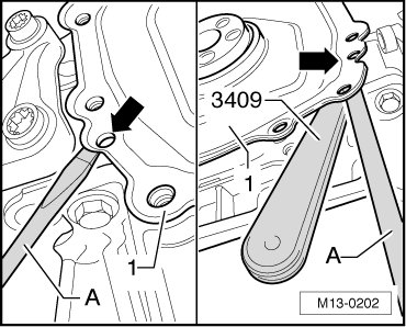 - Begin at the alignment bushings - arrows - and pry off the sealing flange - 1 - using a suitable screwdriver - A -.
