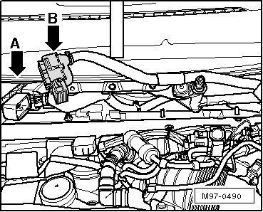 - Remove the connector - arrow B - on the engine control module - arrow A -.