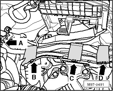 - Unclip the wiring guide near the transmission mount - arrows B through D -.