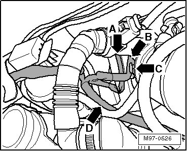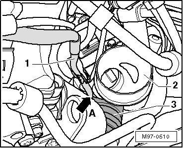 - Carefully guide the wire - 1 - out between the turbocharger intake scoop - 2 - and the pre-heating hose - 3 - - arrow A -.
