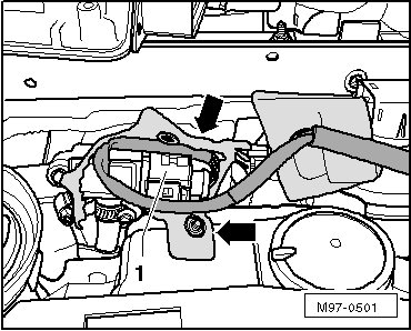 - Disconnect the cable tie on the black 14-pin connector at coupling 1 in the left of the engine compartment - arrow B - and remove the connector from the bracket.